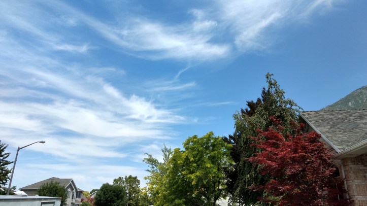 I keep seeing cloud patterns that tell me a storm is coming, but the weather forecast says otherwise. Maybe it’s just me having a stormy attitude. (And weird formatting problems with my blog.)