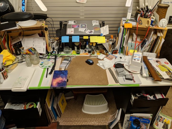 It’s 5:00 AM. I’m up because this mess is my desk and I have to get it completely cleared off before the window cleaners get here at 9:00. Today. I actually woke up at 3:30 AM and realized that I needed to get this done. And then I laid in bed for 1 1/2 hours dreading about it. So now I’m finally up to address the problem.