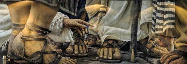 Then I noticed people going downstairs so I followed. When I entered the room I was faced with a mural-sized painting of the woman with an issue of blood touching the robe of Jesus.